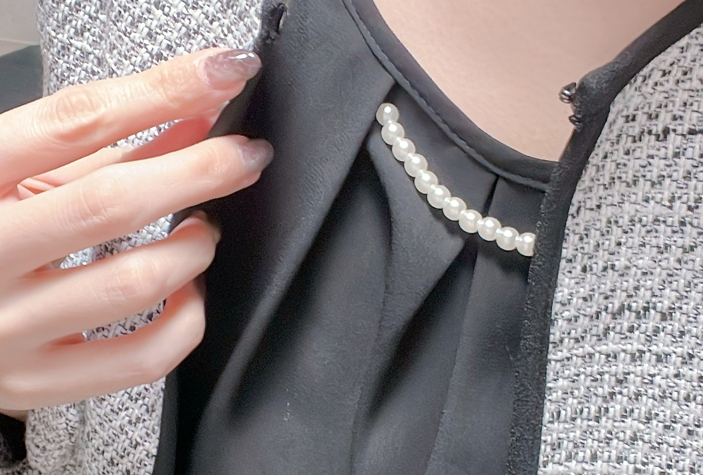 ワンピースの襟元にはパールアクセントがあるので、ネックレスをしなくても首元が華やかになりますよ~!