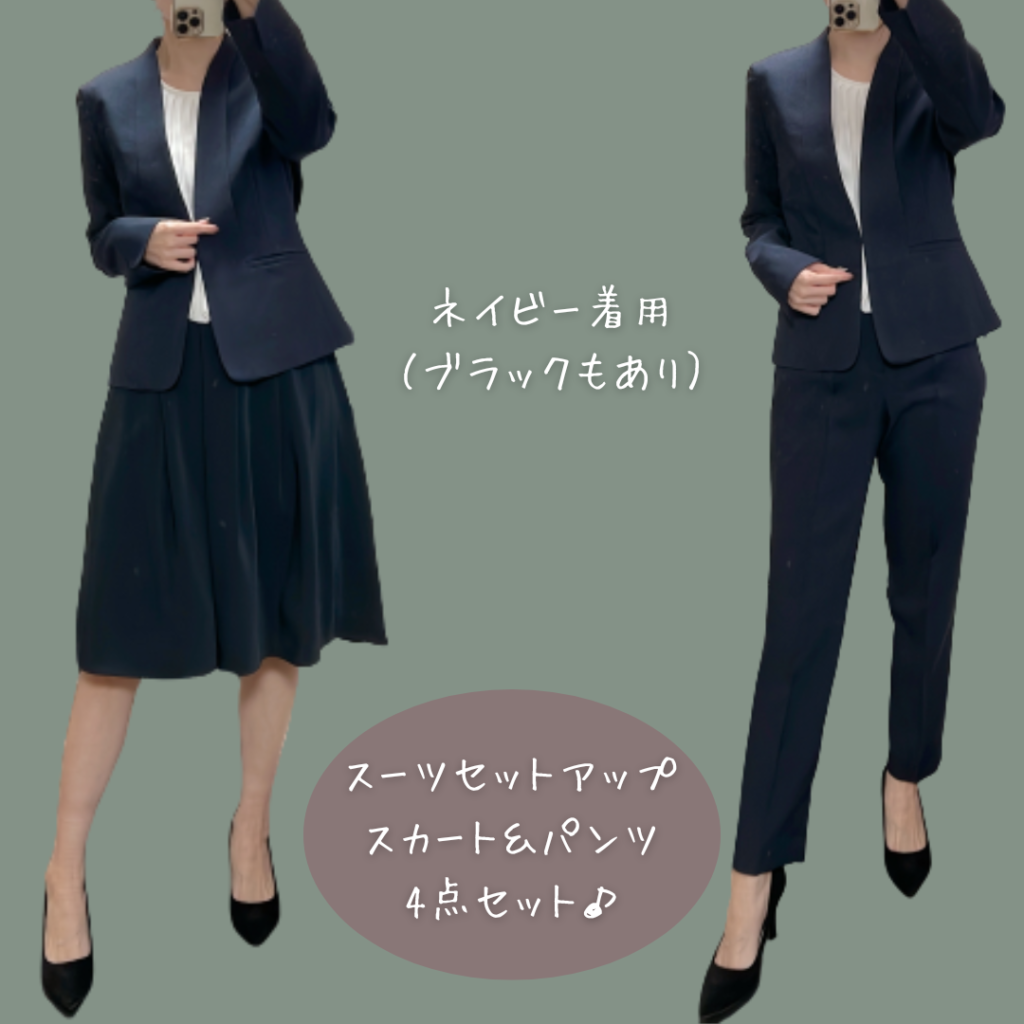 こちらはブラウス・ジャケット・パンツの3点セットで、カラーはネイビーとブラックの2展開。